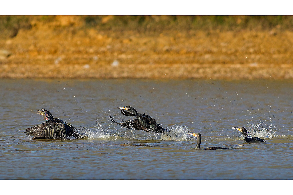 L'arrivée des grands cormorans met fin au calme qui régnait. Ils se chamaillent après la capture d'une grosse perche.